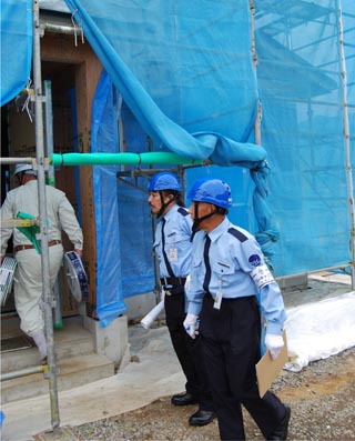 隊員は、早速現場の足場等を点検します。特に今年は、足場の規則の改正もあり手すりや、幅木等入念に点検しました。